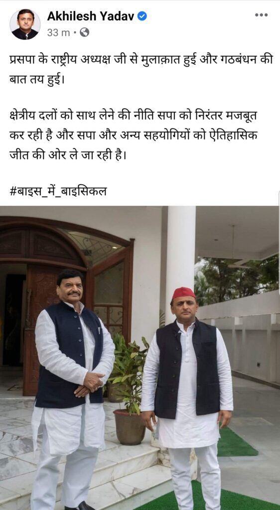 साल 2022 में उत्तर प्रदेश में होने वाले विधानसभा चुनावों को लेकर समाजवादी पार्टी का कुनबा बढ़ता नजर आ रहा है। दरअसल समाजवादी पार्टी क्षेत्रीय दलों के साथ गठबंधन करते हुए विधानसभा 2022 को फतह करने की रणनीति बना रही है । लेकिन अभी तक प्रगतिशील समाजवादी पार्टी से समाजवादी पार्टी का गठबंधन ना होने से राजनीतिक गलियारों में हलचल मची हुई थी। क्योंकि प्रगतिशील समाजवादी पार्टी के राष्ट्रीय अध्यक्ष शिवपाल सिंह यादव ने समाजवादी पार्टी से अलग होकर अपने दल की स्थापना की थी। और दोनों ही दल अपने राजनीतिक मनमुटाव की वजह से एक दूसरे के विरोध में खड़े थे। लेकिन आज समाजवादी पार्टी के राष्ट्रीय अध्यक्ष अखिलेश यादव द्वारा सोशल मीडिया पर की गई अपनी पोस्ट से बहुत सारी राजनीतिक अटकलों पर विराम लगा दिया।