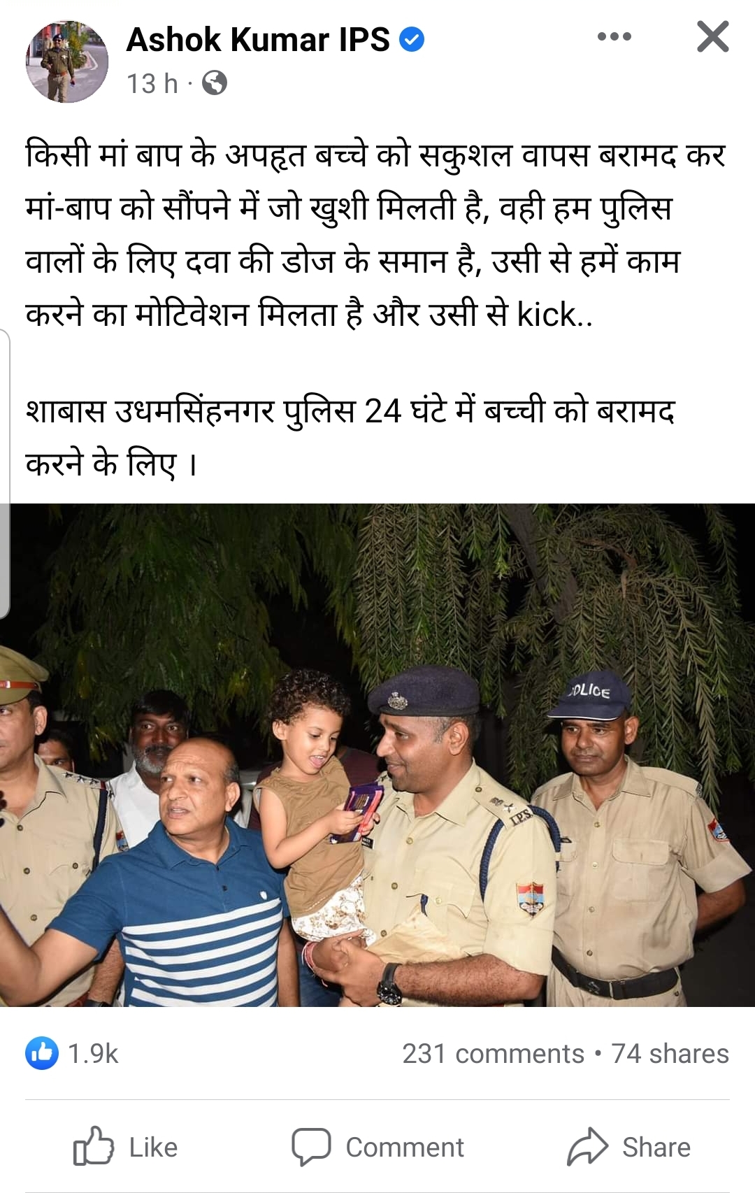 उत्तराखंड के डीजीपी अशोक कुमार ने जनपद उधम सिंह नगर की पुलिस टीम की तारीफ सोशल मीडिया के माध्यम से करते हुए कहा की एक अपरहण की गई बच्ची को 24 घंटे के अंदर उधम सिंह नगर पुलिस ने सकुशल बरामद कर बड़ा काम किया है…