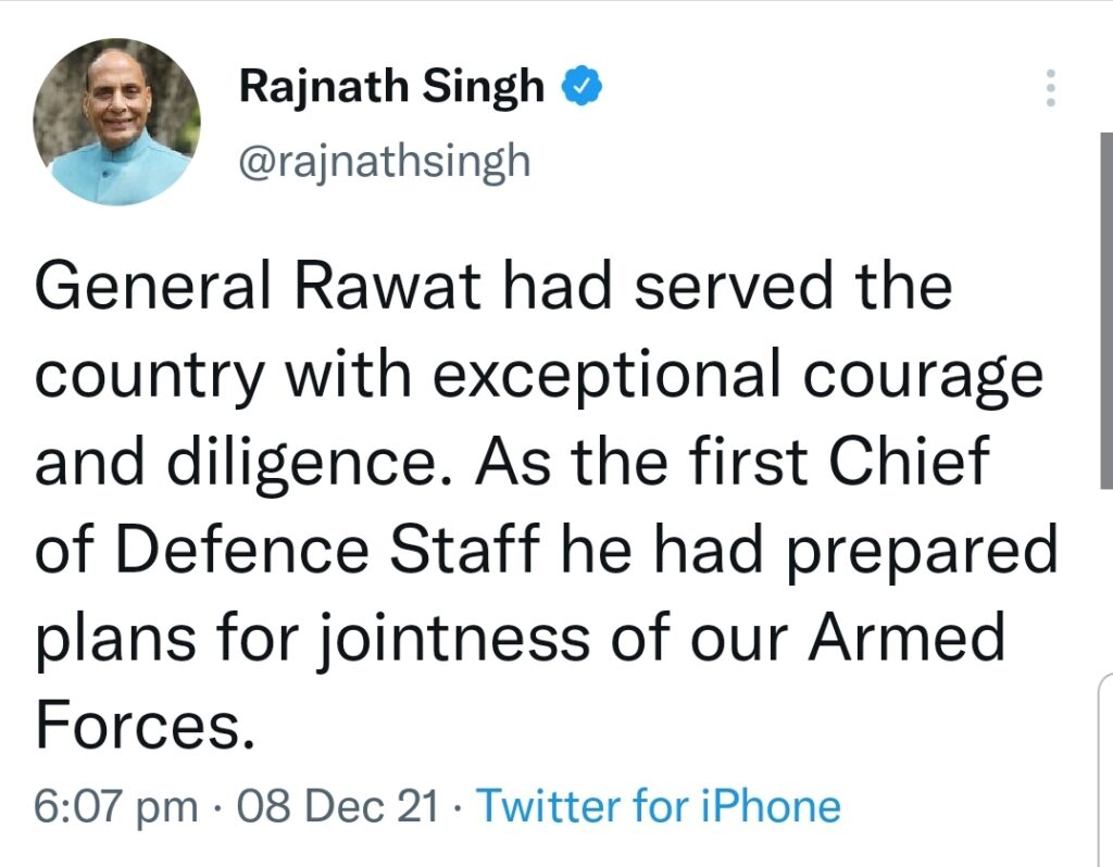 देश के पहले CDS का दायित्व संभाल रहे जनरल बिपिन रावत MI 17 हेलिकॉप्टर के क्रैश होने से नहीं रहे । इस विमान में उनकी पत्नी मधुलिका के साथ कुल 14 लोग सवार थे । यह दुर्घटना तमिलनाडु के वेलिंगटन के पास कुन्नूर में नीलगिरी पहाड़ी पर हुई । इस दुर्घटना की खबर से पूरे देश में शोक की लहर दौड़ गई है । देश के प्रधानमंत्री नरेंद्र मोदी ने भी इस दुर्घटना पर दुख व्यक्त किया है । इस खबर की पुष्टि वायुसेना की ओर से की गई है। रक्षा मंत्री राजनाथ सिंह ने भी ट्वीट करके जनरल बिपिन रावत के प्रति संवेदना व्यक्त करते हुए लिखा है कि उन्होंने पूरे साहस के साथ देश की सेवा की ।